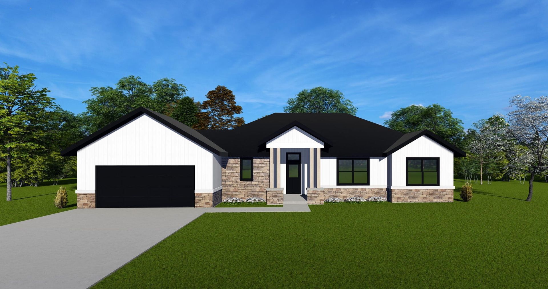 The exterior will have a covered patio, black lighting and sod in the front yard. Your choice of a partial brick or stone front and hard siding on the sides and back of the home.